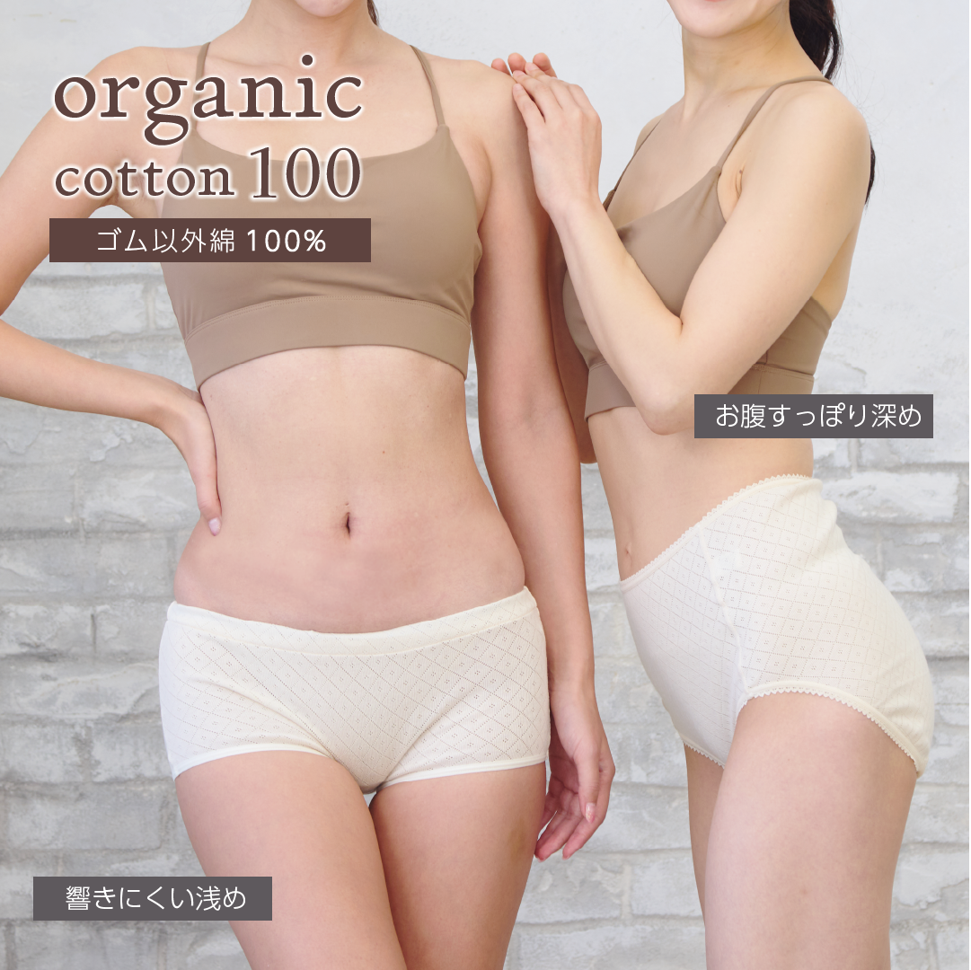響きにくい浅履きとお尻をすっぽり包む深履きが選べるオーガニックコットンショーツです。