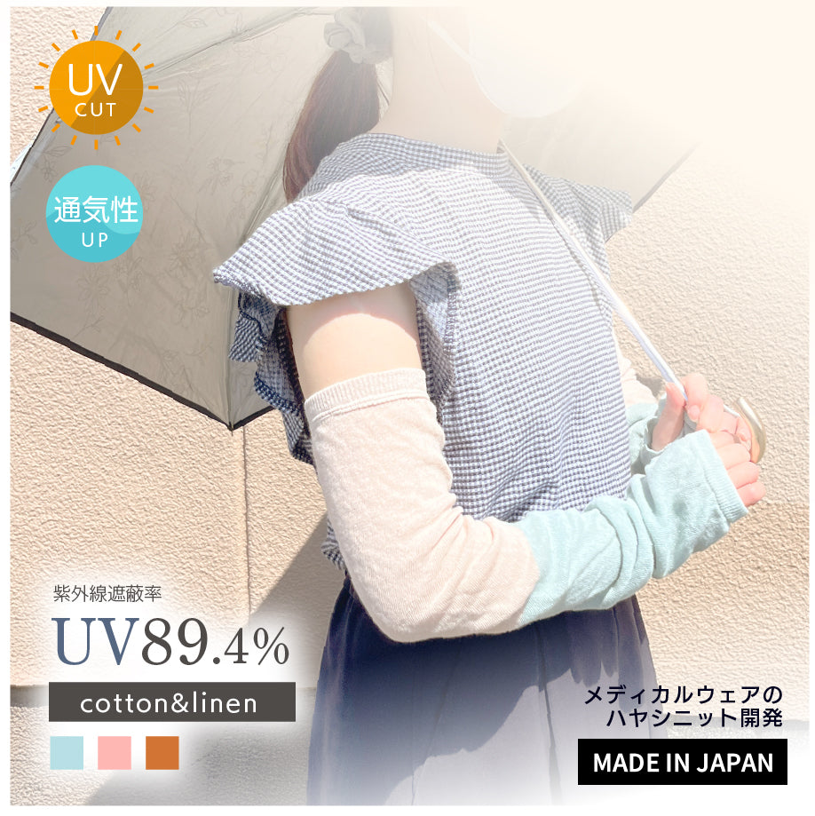 UV89.4%カットの綿麻アームカバー。薄くて通気性がよく、おしゃれなツートンカラーの3色展開です。