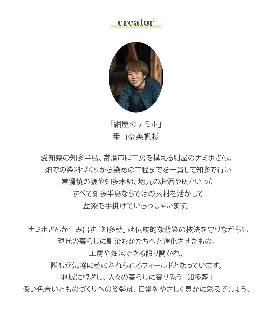 お手入れ | ●製造時期により編み方や風合いが変わる場合があります。 ●ニット製品なので 1〜2cm の誤差があります。着用感・機能性は変わりませんのでご安心ください。 ●スタッフが実物に近い状態で撮影しておりますが、モニター等の都合上相違が発生する場合がございます。あらかじめご了承ください。 ※藍染製品についての注意※ 当製品は、知多藍の「すくも」を使い、伝統的な「天然灰汁発酵建て」で染め上げました。取り扱いに関して、以下を一読ください。 ご購入まずはぬるま湯で、優しく手洗いすることをおすすめします。洗濯時に茶色い灰汁が出る場合がありますが、これは天然藍特有で、洗濯を繰り返すうちに灰汁が抜け、青みが冴え鮮やかになります。蛍光洗剤や漂白剤は避けていただき、中性洗剤のご使用をおすすめします。日光や蛍光灯に弱く、長時間あてると日焼けをして色が薄くなることがあります。保管するときは、タンスやクローゼットなど暗い場所に保管してください。干す際は裏返しにして陰干しをおすすめします。濡れた状態で、他のものと擦れると色移りする可能性があるのでご注意ください。商品はすべて天然藍で、1点1点手染めをしています。時にはムラや線が生じることがありますが、そのような表情も個性として手染めの風合いをお楽しみいただければと思います。 |
